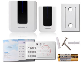 富盈星无线门铃发射器(室外机)简易安装方法(推荐) 1.打开包装盒取出室外机、室内机、铆钉、电池、粘胶。 温馨小提示:由于快递运输部分地区需走航运,故必须拆下电池运输,顾客可以前行各大超市进行